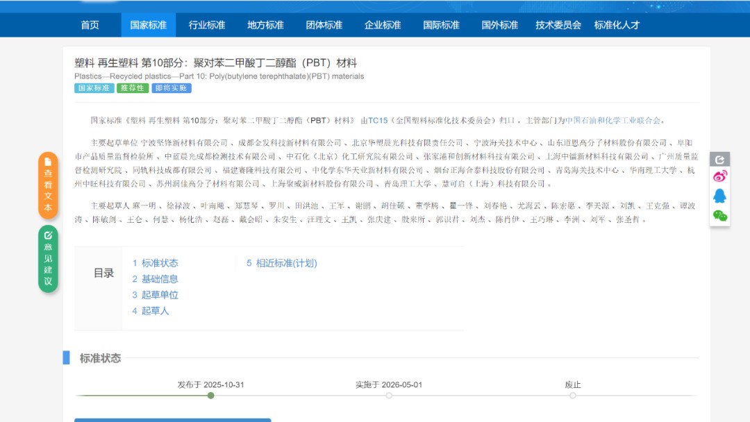 Topcentral® led the drafting of China's national standard for recycled PBT materials, marking a milestone for the standardization of the recycled plastics industry and promoting green, high-quality development.
